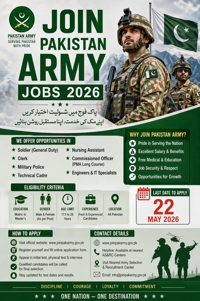 Join Pakistan Army Jobs 2026 is one of the most awaited career opportunities for passionate, disciplined, and patriotic individuals who want to serve their country with honor and pride. Every year, the Pakistan Army announces multiple vacancies for candidates from all educational backgrounds, including Matric, Intermediate, Bachelor’s, and higher qualifications. These jobs are not just employment opportunities but a gateway to a respectable lifestyle, personal growth, and a secure future. In 2026, the Pakistan Army continues its legacy by offering diverse roles such as soldiers, clerks, engineers, medical staff, and commissioned officers, ensuring that every talented individual finds a suitable position according to their skills and qualifications.